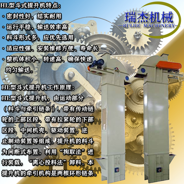 HL型斗式提升機,由運動部分(料斗與牽引鏈條)、帶有傳動鏈輪的上部區段、帶有拉緊輪的下部區段、中間機殼、驅動裝置、逆止制動裝置等組成。提升機的料斗為間斷式布置,利用“掏取法”進行裝載,“離心投料法”卸料。本提升機的牽引機構是兩根環形鏈條。